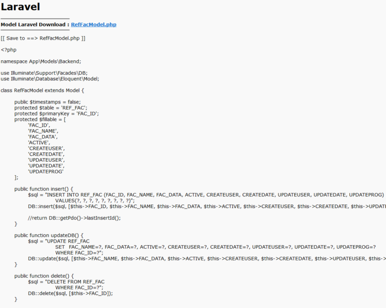 โปรแกรมจะสร้างโค้ดไฟล์ Model และโค้ดไฟล์ Controller ตั้งต้นไว้ให้สามารถคัดลอกไปใช้งานได้เลยหรือจะกด download ไฟล์จากลิ้งชื่อไฟล์ด้านบนก็ได้