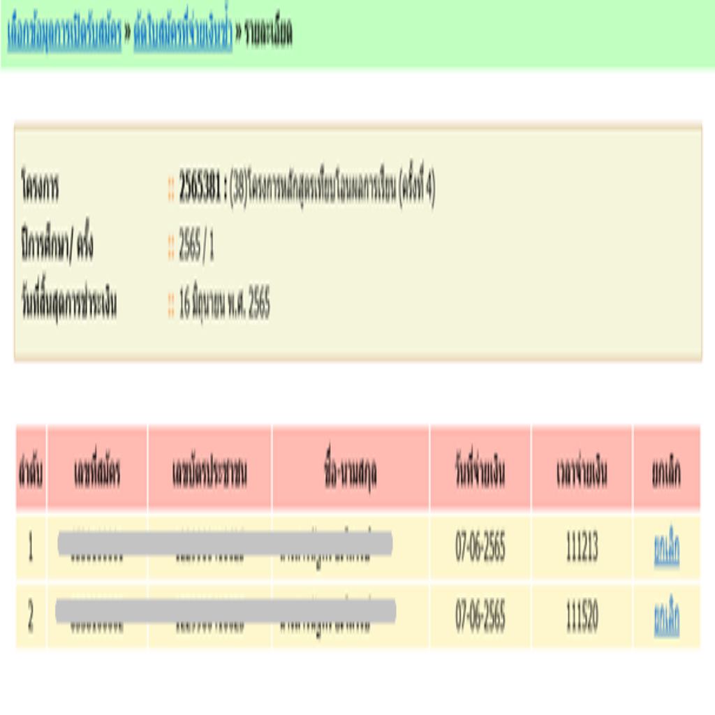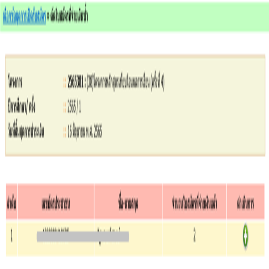 2. คลิกที่ “ตัดใบสมัครที่จ่ายเงินซ้ำ” จะแสดงรายชื่อผู้สมัครที่มีการจ่ายเงินค่าสมัครซ้ำ ภายในโครงการที่เลือก ดังรูป