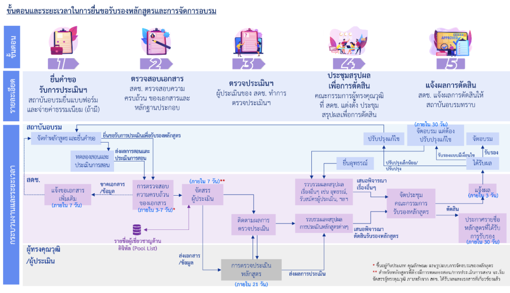 ขั้นตอนการเตรียมการเพื่อยื่นเอกสารขอรับการรับรองหลักสูตรจากสำนักงานคณะกรรมการดิจิทัลเพื่อเศรษฐกิจและสังคมแห่งชาติ (สดช.) จะมีขั้นตอนและระยะเวลาตามแผนผังดังรูป