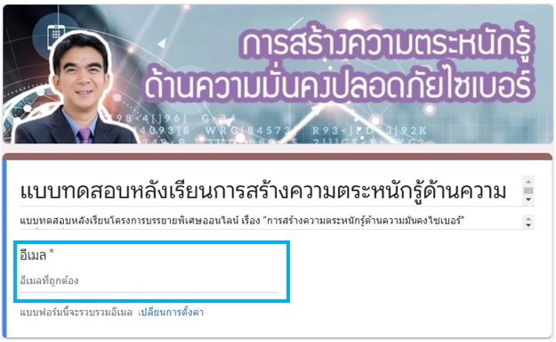 1. สร้างฟอร์มจากโปรแกรม Google Forms ตามรูปแบบกิจกรรมที่ผู้จัดโครงการกำหนดขึ้นมา โดยสิ่งสำคัญคือภายในฟอร์มการทำกิจกรรมจะต้องมีช่องให้ผู้เข้าอบรมใส่อีเมลของผู้เข้าอบรมด้วย เพื่อที่โปรแกรม Google Forms จะได้ส่งผลการทำกิจกรรมกลับไปยังอีเมลของผู้เข้าอบรม เป็นหลักฐานในการทำกิจกรรม ตามภาพด้านล่าง