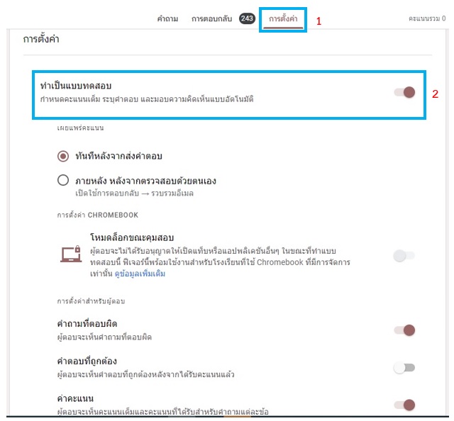 2. เมื่อสร้างฟอร์มเสร็จแล้วหากจะเลือกทำกิจกรรมของผู้เข้าอบรมให้เป็นรูปแบบของแบบทดสอบให้ไปที่เมนู “การตั้งค่า” เลือกเลื่อน เปิด “ทำเป็นแบบทดสอบ” ตามภาพด้านล่าง