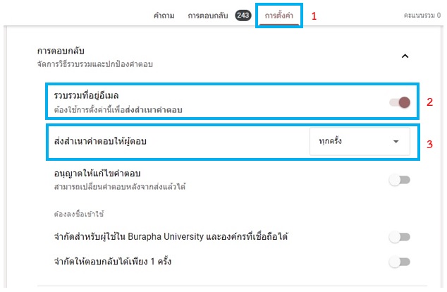 3. จากที่เมนู “การตั้งค่า” เดิมเลื่อนลงมาด้านล่างตรง การตอบกลับ เลือกเลื่อน เปิด “รวบรวมที่อยู่อีเมล” และตรง “ส่งสำเนาคำตอบให้ผู้ตอบ” เลือกเป็น ทุกครั้ง ตามภาพด้านล่าง