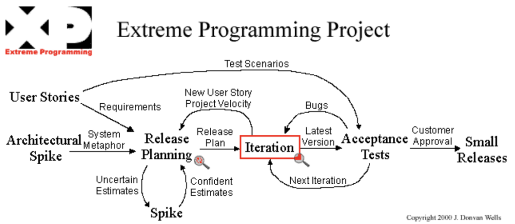 Extreme Programming (XP): เป็นอีกวิธีการตามแนวคิด Agile ซึ่ง XP เน้นความสำคัญในการปฏิบัติเชิงวิศวกรรมซอฟ์ตแวร์ เช่น การพัฒนาที่ขับเคลื่อนด้วยการทดสอบ(test-driven development), การรวมตัวอย่างต่อเนื่อง(Continuous Integration: https://t.ly/L01a) และการเขียนโปรแกรมเป็นคู่(Pair Programming) XP ให้ความสำคัญในความร่วมมือกันระหว่างนักพัฒนาและลูกค้าเพื่อให้แน่ใจว่าซอฟต์แวร์ตรงตามความต้องการของผู้ใช้
