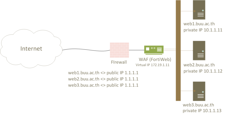 เนื่องด้วยช่วงเดือน พฤษภาคม – มิถุนายน พ.ศ.2566 สำนักคอมพิวเตอร์ได้ทำการทดสอบอุปกรณ์ Web App Firewall (WAF) นอกจากคุณสมบัติหลักของ WAF ที่มีความสามารถในการตรวจจับทุกกิจกรรมการใช้งาน Web Application ของ User ต่าง ๆ และป้องกันภัยคุกคามบน Web Application ส่วนใหญ่ WAF สามารถป้องกันภัยคุกคามได้ตาม OWASP TOP 10 ซึ่งระหว่างที่ทำการทดสอบ (PoC) WAF (ในที่นี้คือ FortiWeb) ได้อ่านเอกสารของ WAF ที่ทำ PoC พบว่า WAF ดังกล่าวมี Feature Multiple Web App on Single Virtual Server หรือ การทำให้ Web App หลายเว็บ สามารถใช้ Virtual IP Server ซึ่งต่อไปจะ Map กับ Public IP ของเครือข่ายมหาวิทยาลัยบูรพาต่อไปได้ ตัวอย่าง คณะ A มี Web App หรือ Web Server จำนวน 10 เครื่อง 10.123.1.a01 – 10.123.1.a10 คณะ A เป็นคณะที่ไม่มีการทำ Reverse Web Proxy กลางของคณะ A ไว้ (ปกติจะใช้งาน nginx ซึ่งเป็น Reverse Web Proxy ที่ใช้งานกันอย่างแพร่หลาย) ทุกครั้งที่คณะ A เพิ่ม Web Server จะดำเนินการขอจดโดเมนเพื่อให้บริการ Web เพื่อให้ใช้งานเข้าจาก Internet ได้ ทำให้สำนักคอมพิวเตอร์ต้องทำ DNAT หรือ Map IP 10.123.1.a01 กับ Public IP 202.28.xy.a01 – 202.28.xy.a10 ทำให้ต้องใช้ Public IP ไปถึง 10 IP แต่ถ้าใช้คุณสมบัติ Content Routing ทำให้เราใช้ Public IP แค่ 1 IP