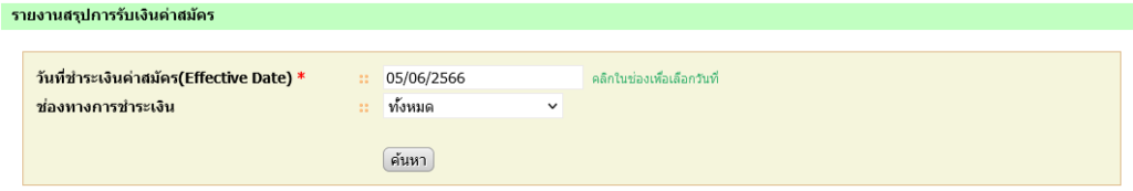 2.เลือกวันที่ชำระเงินค่าสมัคร(Effective Date) และช่องทางการชำระเงิน จากนั้น คลิกที่ “ค้นหา” จะแสดง