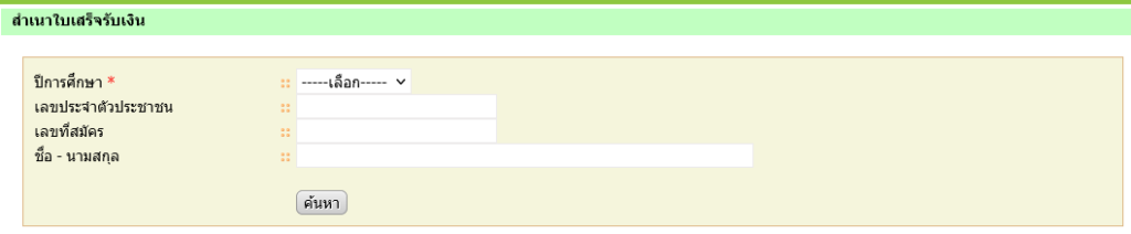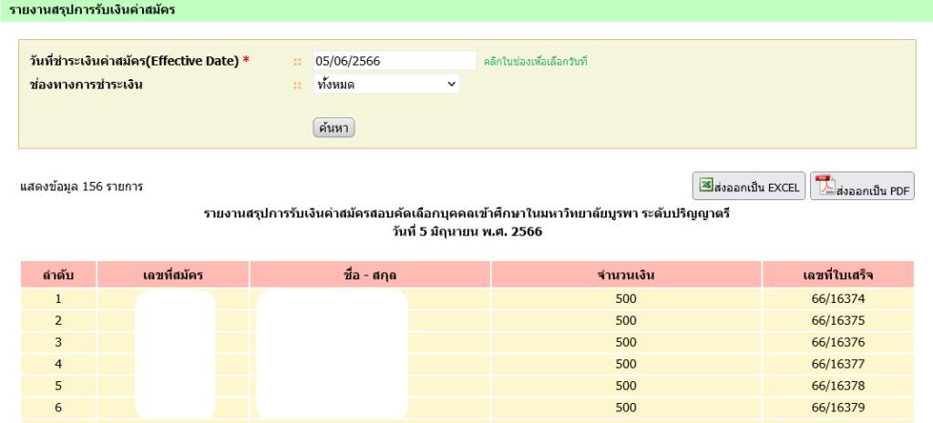 รายงานสรุปการรับเงินค่าสมัครและส่งออกข้อมูลสำเนาใบเสร็จรับเงิน