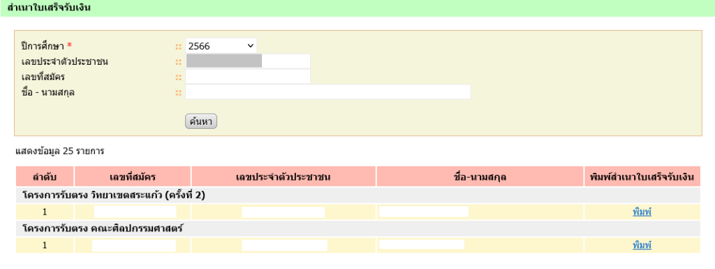 3.หากต้องการพิมพ์สำเนาใบเสร็จรับเงิน ให้คลิกที่ “พิมพ์” ในแถวข้อมูลของผู้สมัครที่ต้อง