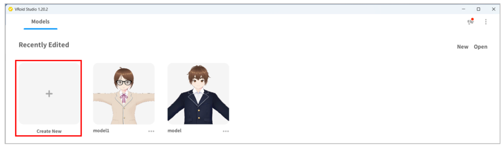- เปิดโปรแกรม VRoid Studio แล้วเริ่มสร้างตัวละครสมมติโดยเริ่มจากการคลิก Create New