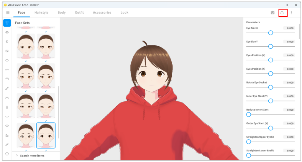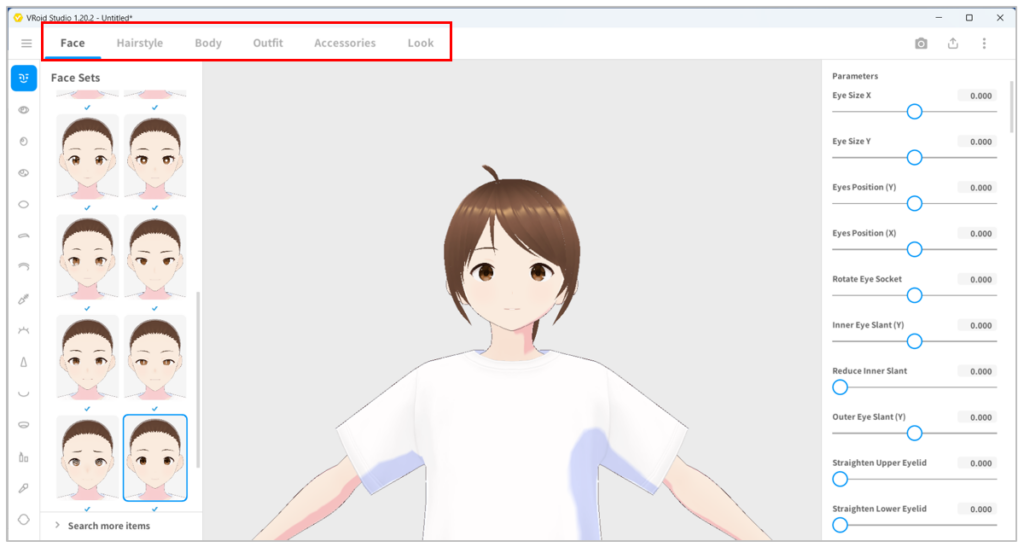- เริ่มสร้างตัวละคร โดยในโปรแกรม VRoid Studio จะประกอบด้วยเมนูหลัก ได้แก่ เมนู Face ใช้จัดการใบหน้า เมนู Hairstyle ใช้จัดการทรงผม เมนู Body ใช้จัดการร่างกาย เมนู Outfit ใช้จัดการเสื้อผ้า เมนู Accessories ใช้จัดการเครื่องประดับ และเมนู Look ใช้จัดการลักษณะภายนอกของตัวละคร