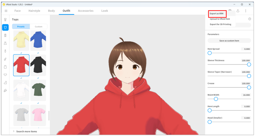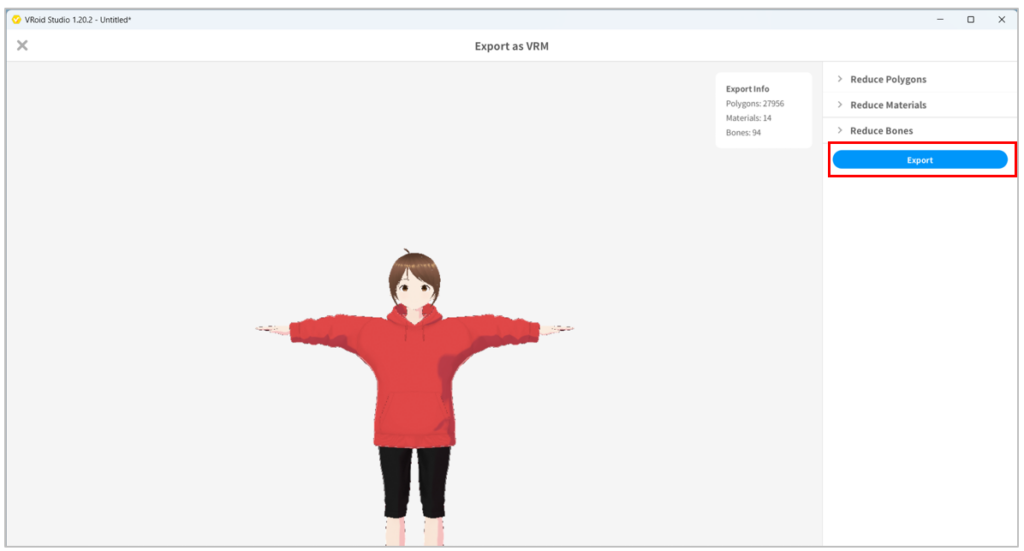 - เมื่อสร้างตัวละครแล้ว จึงทำการ Export ตัวละครเป็นไฟล์ VRM