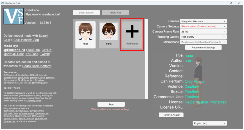 - เปิดโปรแกรม VSeeface แล้วคลิก Add Avatar