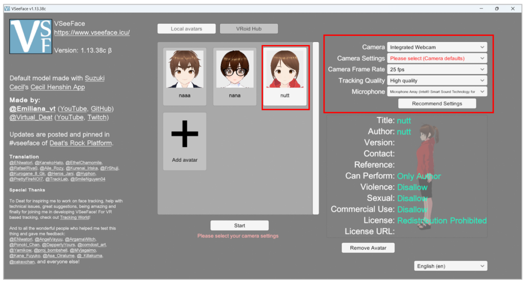 - คลิกเลือกตัวละคร แล้วตั้งค่า Camera, Frame rate, Tracking Quality และ Microphone