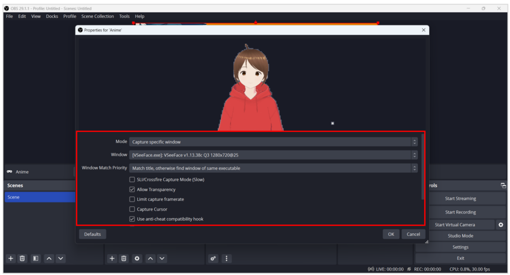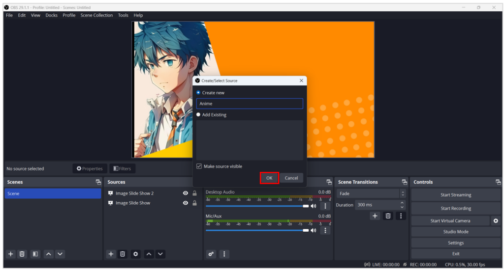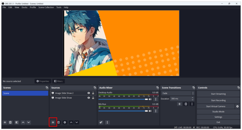 - เปิดโปรแกรม OBS Studio แล้วคลิก Add Source เพื่อเพิ่ม Scene ตัวละครสมมติ