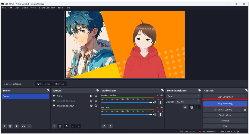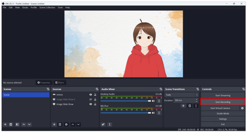- จัดเรียง Scene และจัดวางองค์ประกอบ แล้วเริ่มบันทึกวิดีโอ โดยคลิก Start Recording