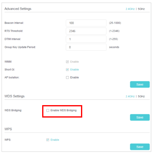•โดยทั่วไปฟังก์ชั่นการเชื่อมต่อ WDS สามารถเปิดใช้งานได้ทั้งในความถี่ 2.4GHz หรือ 5GHz สำหรับเราเตอร์ดูอัลแบนด์ แต่สำหรับรุ่นเช่น Archer VR600 และ Archer VR600v, WDS จะใช้ได้เฉพาะในความถี่ 2.4GHz เท่านั้น เราใช้ฟังก์ชันการเชื่อมต่อ WDS ในความถี่ 2.4GHz เป็นตัวอย่าง