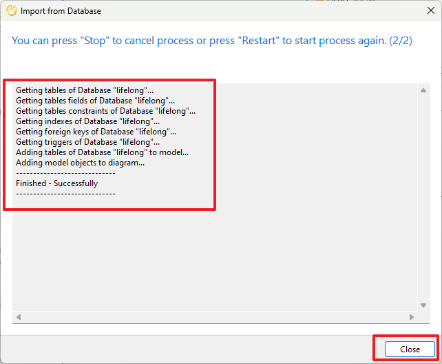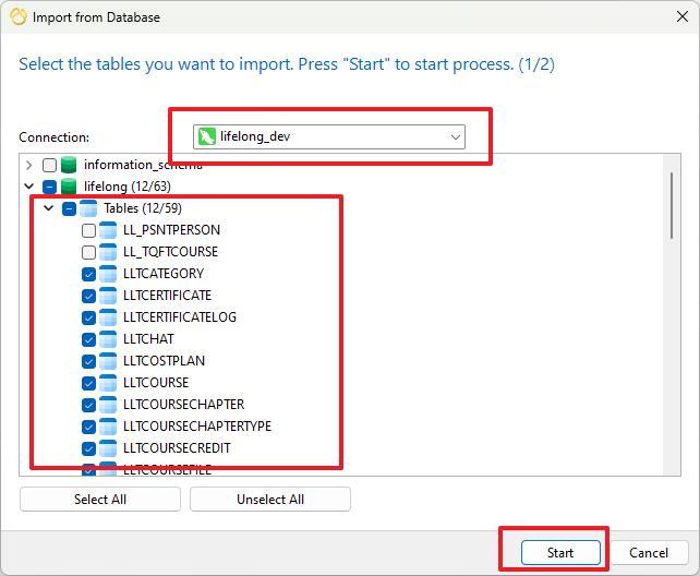 ๓) คลิกที่ File -> Import from Database จากนั้นเลือกการเชื่อมต่อฐานข้อมูล เลือกตารางที่ต้องการ และคลิกปุ่ม Start