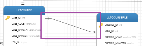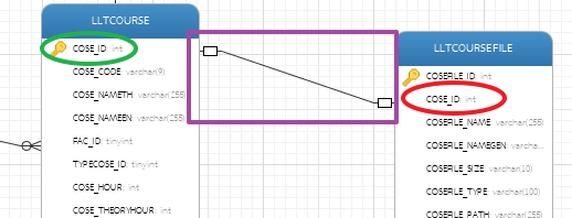 ๗) กรณีที่ต้องการเพิ่มเส้นความเชื่อมโยงของตาราง ให้คลิกที่ แล้วคลิกที่ฟิลด์ของตารางต้นทาง (ตารางลูก Referencing วงรีสีแดง) ไปหาฟิลด์ของตารางปลายทาง (ตารางแม่ Referenced วงรีสีเขียว) จะได้เส้นความสัมพันธ์ (สีเหลี่ยมสีม่วง) ให้ทำการกำหนดคาร์ดิแนลิตี้ (Cardinality) ของความสัมพันธ์ ที่แท็บ Object ดังนี้