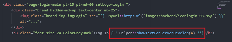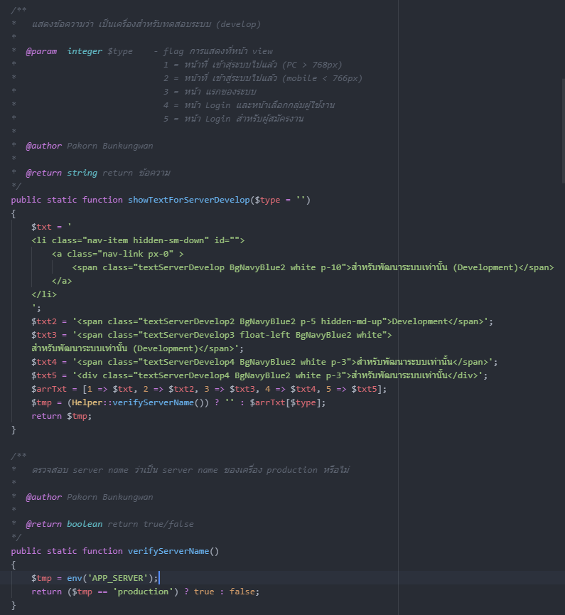2. สร้างฟังก์ชันเพื่อแสดงข้อความเพื่อแยกความแตกต่างระหว่างเครื่องเซิร์ฟเวอร์ที่อยู่ระหว่างพัฒนา (Development) กับเครื่องเซิร์ฟเวอร์ที่ให้ผู้ใช้ใช้งานจริง (Production) โดยตั้งชื่อฟังก์ชัน showTextForServerDevelop ที่โฟลเดอร์ app/Models/Helper.php ดังภาพที่ 2