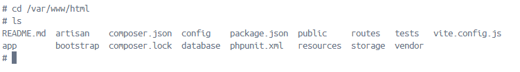 ๑. เข้าไปที่ terminal ใน docker container พิมพ์คำสั่ง cd /var/www/html เพื่อไปที่ path โปรแกรม แล้วลอง ls ดูว่าอยู่ที่โปรแกรมเราหรือยัง