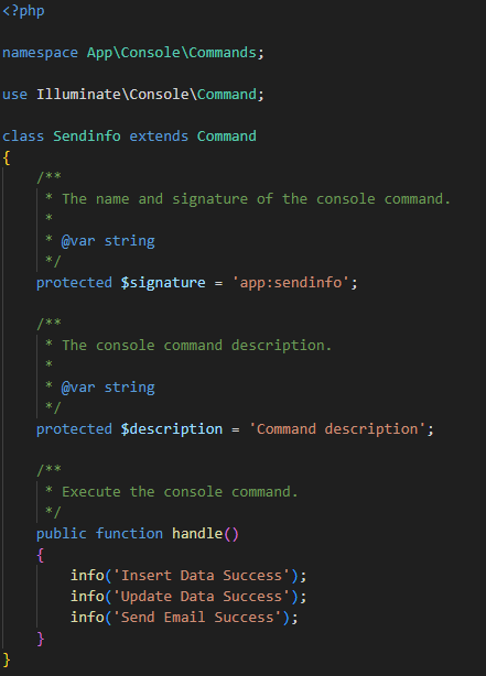 ๓. เปิดไฟล์ Sendinfo.php ที่ path app/Console/Commands/Sendinfo.php สังเกตตัวแปล $signature ‘app:sendinfo’ คือการกำหนดชื่อคำสั่ง ให้เขียนโปรแกรมคำสั่งที่จะใช้งาน เช่น insert ข้อมูล, update ข้อมูล, ส่งอีเมล ฯลฯ ที่ฟังก์ชัน handle