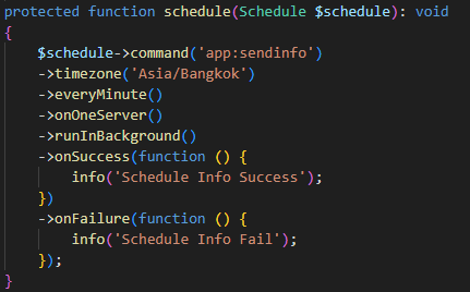 ๔. เปิดไฟล์ Kernel.php ที่ path app/Console/Kernel.php สร้าง schedule โดยใช้ชื่อคำสั่งที่ตั้งไว้จากหัวข้อ ๔.๒.๓ สามารถศึกษา option command เพิ่มเติมได้ที่ https://laravel.com/docs/master/scheduling