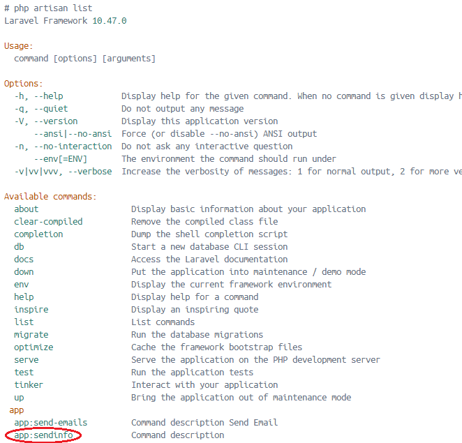 ๕. กลับไปที่ terminal ใน docker container พิมพ์คำสั่ง php artisan list จะเห็นว่ามีคำสั่ง app:sendinfo ที่เราเพิ่มขึ้นมา