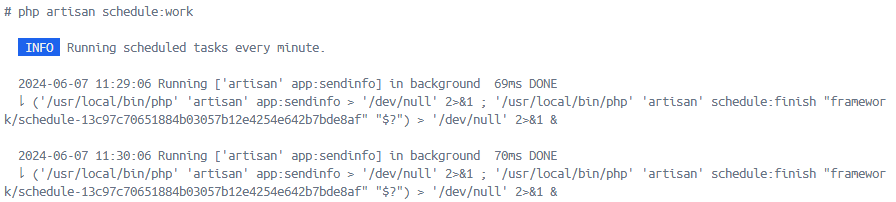 ๖. ทดสอบการใช้งาน schedule ในโหมด develop ด้วยการพิมพ์คำสั่ง php artisan schedule:work ใน terminal docker หากต้องการหยุดการทำงานให้ stop docker container