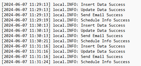 โปรแกรมถูกรันคำสั่งตามเวลาที่ตั้งไว้ โดยในตัวอย่างได้ตั้งเวลาไว้ทุก 1 นาที ->everyMinute() สามารถดู option อื่นเพิ่มเติมได้ที่ https://laravel.com/docs/master/scheduling#schedule-frequency-options และเมื่อโปรแกรมทงานสำเร็จจะถูกเขียนข้อความไว้ที่ log ไฟล์