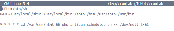 หากต้องการรันใช้งานบน production จะต้องเข้าไปสร้าง cron job โดยพิมพ์คำสั่ง crontab –e แล้วเพิ่มคำสั่ง * * * * * cd /var/www/html && php artisan schedule:run >> /dev/null 2>&1 ไว้บรรทัดล่างสุด