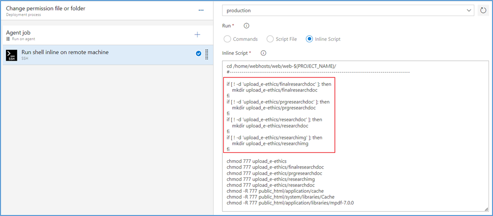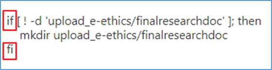3. เขียน Script ตรวจสอบในช่อง Inline Script ตัวอย่างเช่น ต้องการตรวจสอบว่ามีโฟลเดอร์ “upload_e-ethics/finalresearchdoc” หรือไม่ ถ้าไม่มีให้สร้างโฟลเดอร์นี้ขึ้นมา ให้ผู้พัฒนาระบบเขียน Script ตามตัวอย่าง