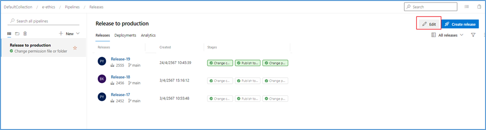 - เข้าเว็บ Azure-sv แล้วไปที่เมนู Pipelines -> Releases -> Edit ดังรูป