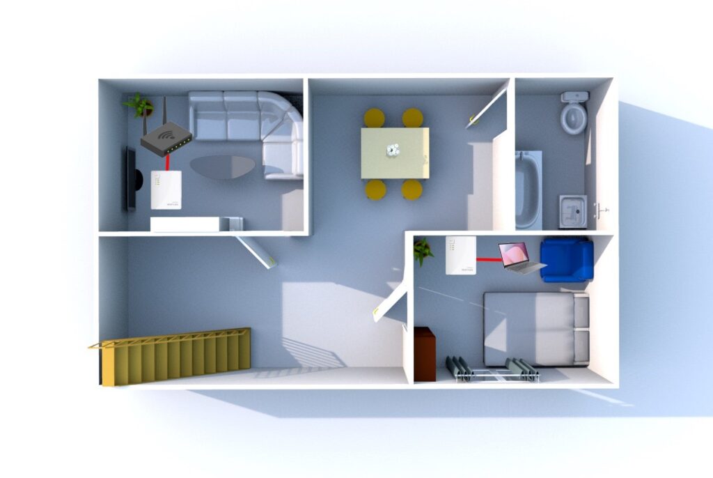 จะเห็นได้ว่าการนำอุปกรณ์ Powerline มาใช้งานนั้น ค่อนข้างสะดวกมากไม่ต้องเสียเงินลากสายแลนเพิ่ม เพราะการวางระบบสายแลนนั้นจะต้อง เจาะผนังหรือเจาะฝ้าร้อยท่อ ซึ่งค่อนข้างยุ่งยาก Powerline นั้นแค่มีไฟฟ้าภายในบ้าน เราก็สามารถขยายจุดใช้งานอินเตอร์เน็ตได้แล้วดังภาพ