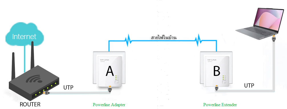 เสียบตัว A ใว้ในห้องที่มีเราเตอร์ หรือ อยู่ไกล้กับตัวเราเตอร์ เพื่อความสะดวกในการเชื่อมต่อสายแลน และ นำตัว B ไปใว้ในจุดที่จะใช้อินเตอร์เน็ต
