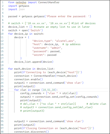 โปรแกรม set_vlan.py จะเป็นคำสั่งในการตั้งค่า vlan แสดง vlan โปรแกรมจะทำงานกับอุปกรณ์ที่ละตัวโดยตัดการเชื่อมต่อจากอุปกรณ์เดิม แล้วเชื่อมต่ออุปกรณ์ใหม่ จนครบตามจำนวนอุปกรณ์ที่เราตั้งค่าไว้