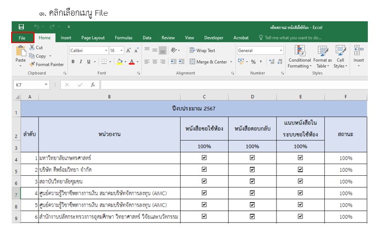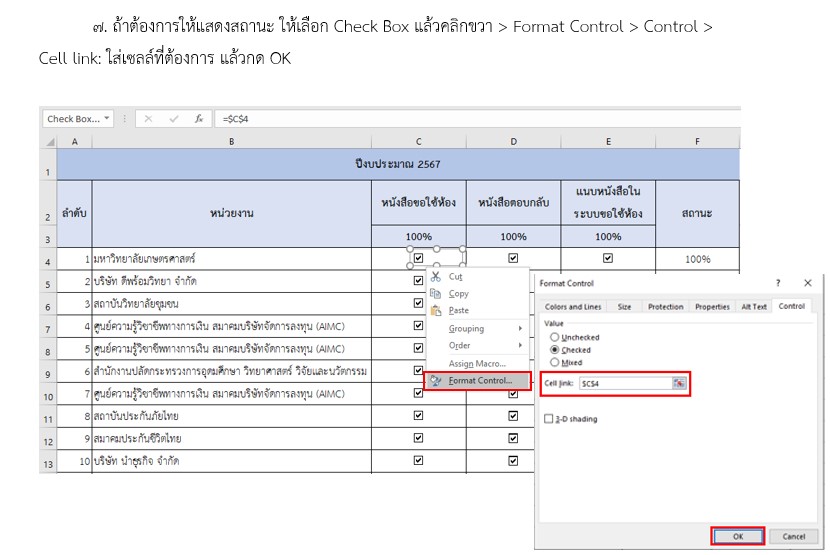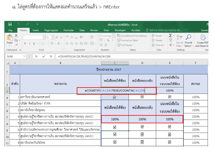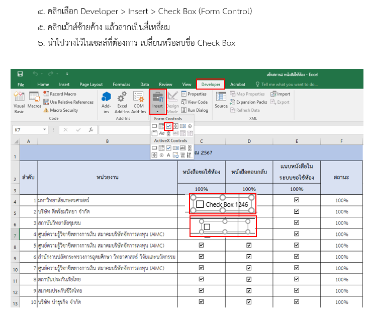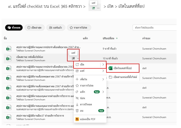 ในการใช้งานอยู่เสมอ โดยฝ่ายบริการวิชาการมีนโยบายในการให้บริการห้องปฏิบัติการคอมพิวเตอร์/ห้องบรรยาย ทั้งในวันเวลาราชการและวันหยุดราชการ ซึ่งมีหน่วยงานทั้งภายใน และภายนอกมหาวิทยาลัยมาขอใช้ห้องให้บริการห้องปฏิบัติการคอมพิวเตอร์/ห้องบรรยาย ในบางครั้งมีการส่งหนังสือขอใช้ห้องมาในเวลาพร้อม ๆ กันหลายฉบับ ทำให้จำไม่ว่าได้ทำหนังหนังสือตอบกลับหรือยัง ทางเจ้าหน้าที่ดูแลห้องจึงได้นำโปรม Microsoft Excel เพื่อมาช่วยในการเช็คสถานะของหนังสือขอใช้ห้องในการให้บริการห้องปฏิบัติการคอมพิวเตอร์/ห้องบรรยาย เมื่อประสานงานกับลูกค้าเบื้องต้นแล้วลูกค้าตกลงมาใช้ห้องปฏิบัติการคอมพิวเตอร์/ห้องบรรยาย เจ้าหน้าดูแลห้องจะประสานให้ลูกค้าทำหนังสือขอใช้ห้องส่งมาให้ทาง e-mail หรือ Line และเจ้าหน้าที่ดูแลห้องจะทำการส่งต่อให้กับงานสารบรรณ เพื่อเสนอเอกสารให้ผู้อำนวยการหรือรองผู้อำนวยการที่ได้รับมอบหมายทราบและพิจารณา มอบให้หัวหน้าฝ่ายบริการดำเนินการต่อ และหัวหน้าฝ่ายบริการแจ้งให้เจ้าหน้าที่ดูแลห้องดำเนินการในขั้นตอนต่อไป ได้แก่ ประสานงานผู้เกี่ยวข้อง และทำหนังสือตอบกลับหน่วยงานของลูกค้าที่ขอใช้บริการแต่ในการดำเนินงาน ในบางครั้งมีการส่งหนังสือขอใช้ห้องมาในเวลาพร้อม ๆ กันหลายฉบับ อาจทำให้เจ้าหน้าดูแลห้อง และหัวหน้าฝ่ายบริการวิชาการจำไม่ได้ว่าได้ทำหนังสือตอบกลับฉบับไหนไปบ้างแล้ว เจ้าหน้าที่ดูแลห้องจึงสร้าง checklist บน Excel 365 เพื่อตรวจเช็คสถานะของการดำเนินงานเพื่อให้สามารถตรวจสอบและติดตามสถานะของการดำเนินงานการจัดทำเอกสารในขั้นตอนต่าง ๆ ได้ โดยขั้นตอนการสร้าง checklist บน Excel 365 สามารถทำได้ดังนี้