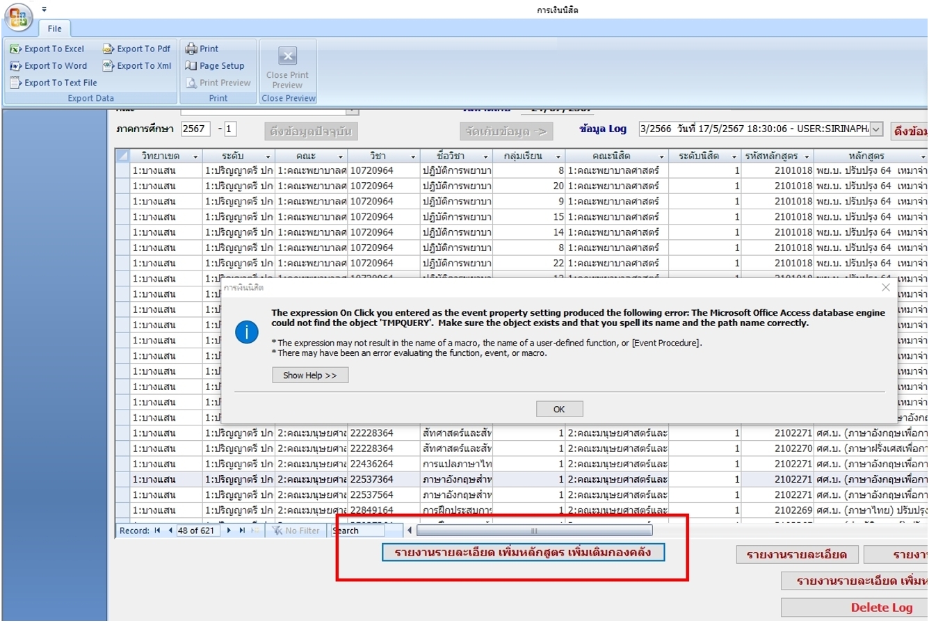เนื่องจากระบบบริการการศึกษามีการพัฒนาต่อยอดในส่วนของ Back office ที่มีการพัฒนาด้วยโปรแกรม Microsoft Access ในบางครั้งอาจจะพบปัญหาในระยะที่มีการใช้งานของผู้ใช้งานครั้งแรกได้ ซึ่งในกรณีนี้ คือ เกิด error : The expression On Click you entered as the event property setting produced the following error. ดังรูปด้านล่าง