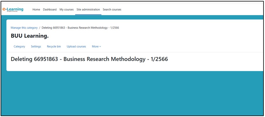 กรณีที่ไม่สามารถลบรายวิชาได้ผ่านในส่วนของหน้าบ้านของระบบ BUU LMS เมื่อพยายามที่จะลบรายวิชาดังกล่าวระบบจะขึ้นค้างตามภาพด้านล่าง หลังจากกด Refresh แล้วทดสอบค้นหารายวิชาบนระบบยังคงพบว่ารายวิชาดังกล่าวที่การลบออกไปนั้นยังคงมีอยู่ระบบ