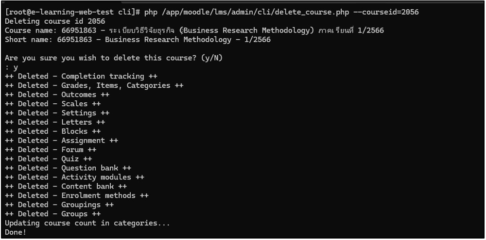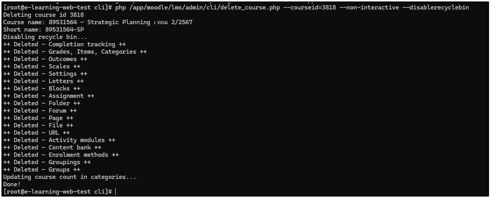 1. แก้ปัญหาโดยการรัน Script ของ delete_course.php เพื่อลบรายวิชา โดยใช้คำสั่ง php /app/moodle/lms/admin/cli/delete_course.php –courseid=xxxx