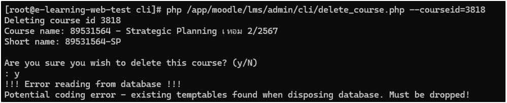ให้ใช้สั่ง php /app/moodle/lms/admin/cli/delete_course.php –courseid=xxxx –non-interactive –disablerecyclebin แทน